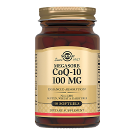 Составмасло рисовых отрубей, желатин, коэнзим Q-10 (убихинон), глицерин (носитель), соевый лецитин (эмульгатор), паприка (краситель), диоксид титана (краситель).ОписаниеБренд Solgar (Солгар) - всемирно известный производитель высокоэффективных натуральных препаратов для здоровья.Капсулы «Коэнзим Q-10 100 мг» (MEGASORB CoQ-10 100 mg Softgels)- сба..